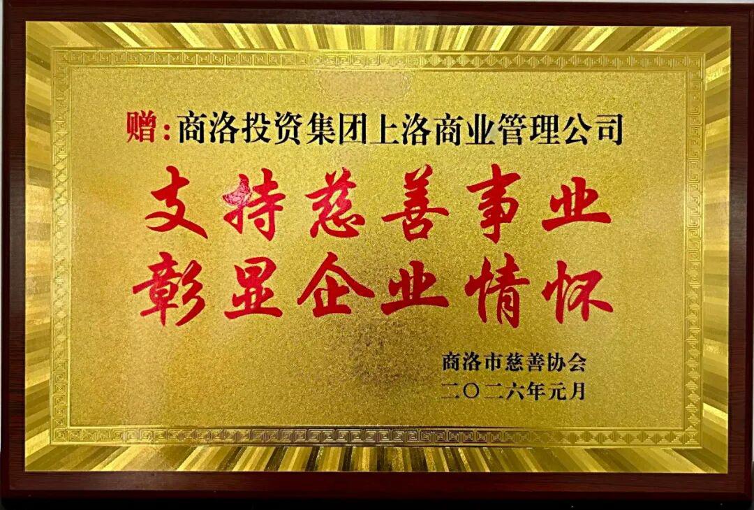 陕西上洛商业管理有限责任公司始终积极响应公益号召,主动投身各类慈善公益事业。此次获奖不仅是一份荣誉,更是一份责任与鞭策。下一步,公司将进一步加大公益参与力度,持续拓展慈善合作维度,助力慈善文化广泛传播与公益事业高质量发展,在商洛市投资集团的领导下为商洛市慈善事业的蓬勃发展注入更多力量,以实际行动践行“取之于社会、用之于社会”的责任担当。