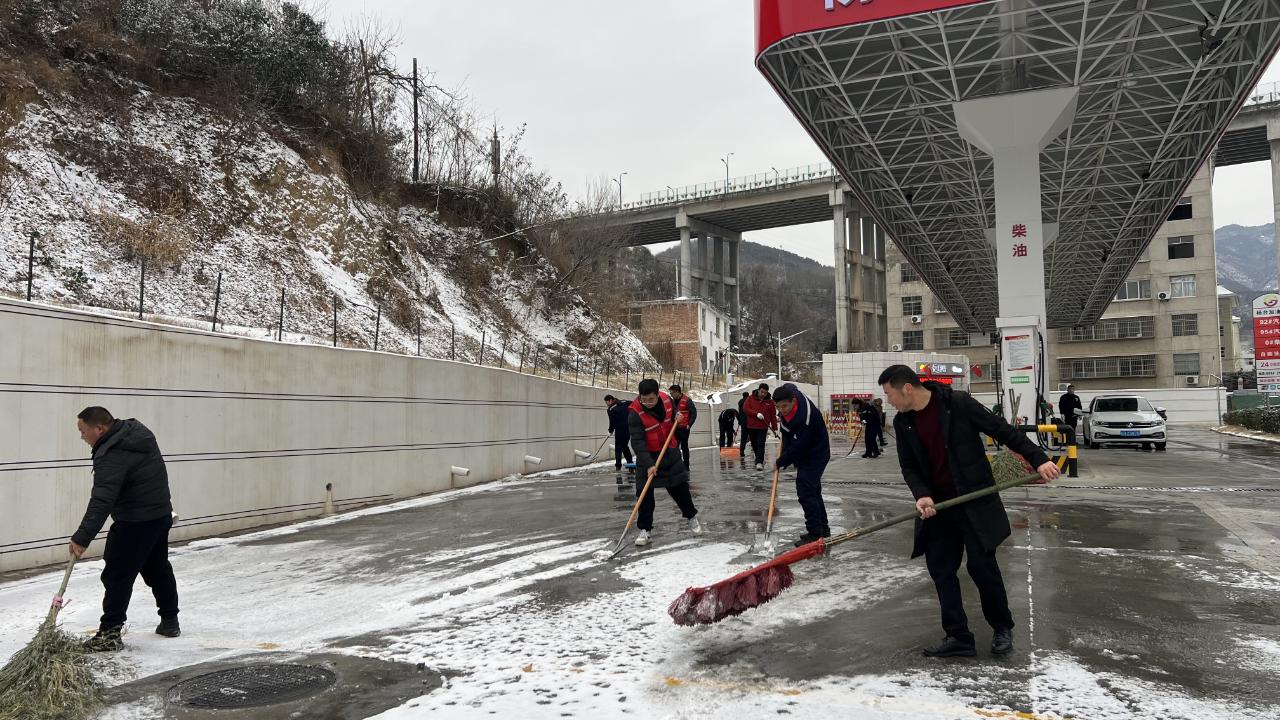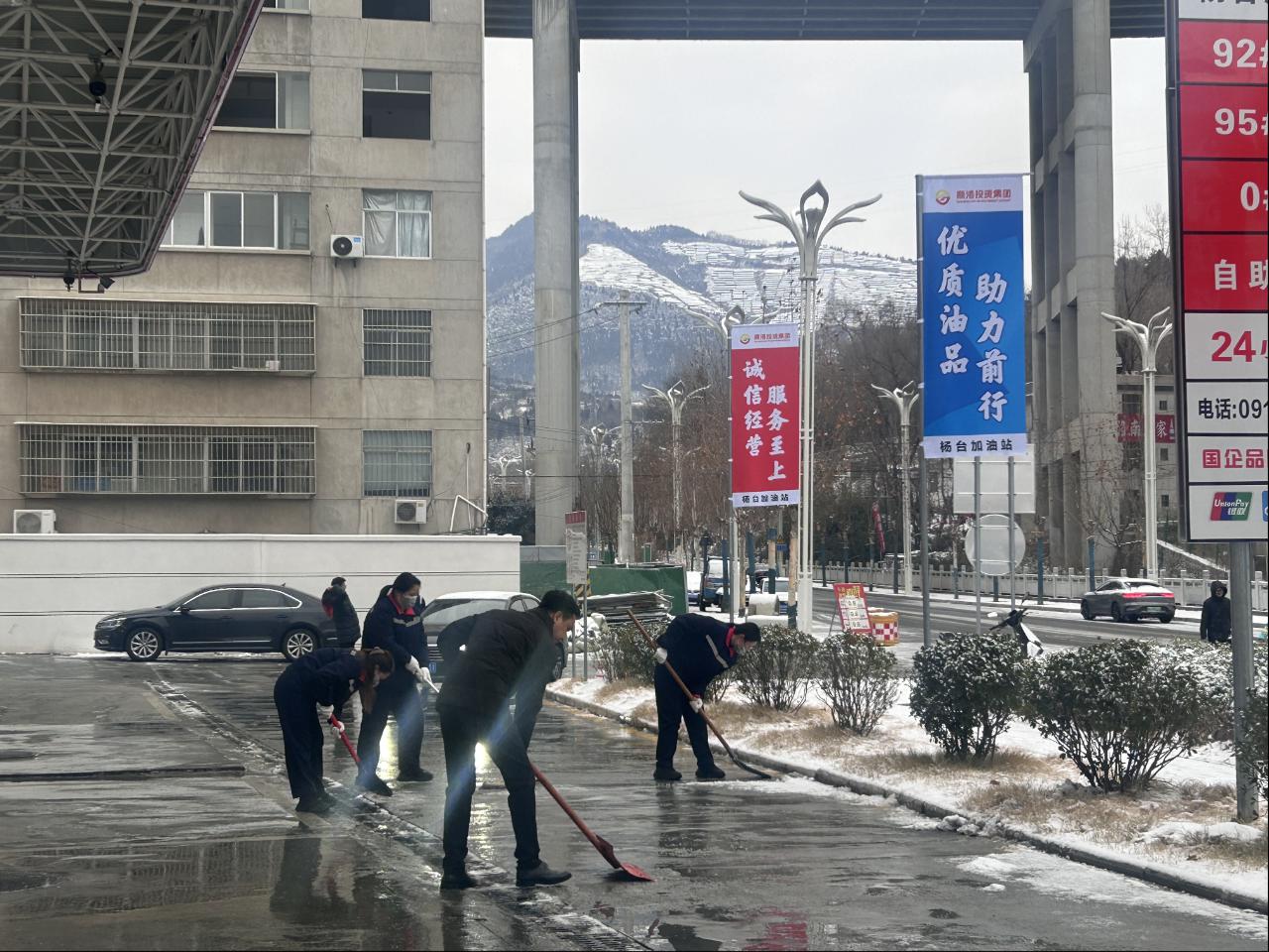 现场,大家统一佩戴防滑手套,在接受安全提醒和工具使用说明后,分组对加油站出入口、人行步道、台阶等易滑易摔部位进行积雪清扫,并科学撒布工业盐,在关键节点铺设草垫等防滑材料,同步设置临时安全提示标识,多举措降低行人滑倒、车辆打滑等风险,全力保障群众通行安全。